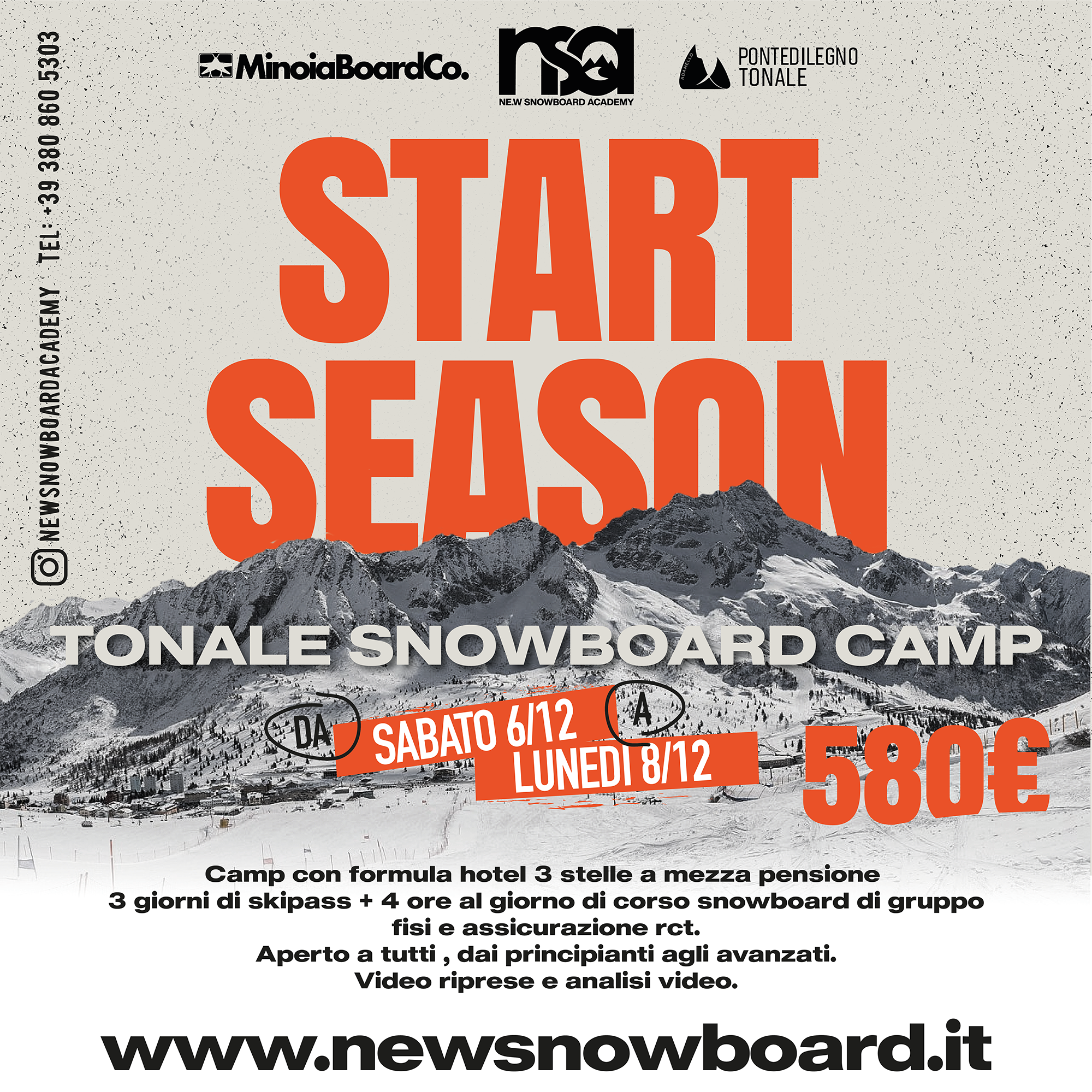 NSA organizza il primo snowboard camp della stagione in Tonale. Dal 6/12 al 8/12 Camp con formula hotel 3 stelle a mezza pensione, + 3 giorni di skipass + 4 ore al giorno di corso snowboard di gruppo + fisi e assicurazione rct.